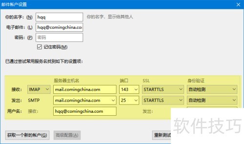 7、 接收邮件服务器地址为 mail.xxx.xx(请替换为实际域名或公网IP),端口使用143,协议选择IMAP。