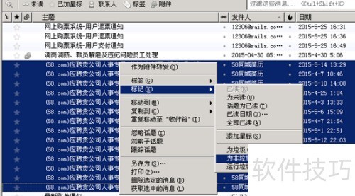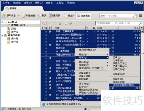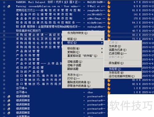 1、 对于已接收的邮件,包括部分垃圾邮件,若逐一处理较为繁琐,可全选需过滤的邮件,右键选择标记中的运行垃圾邮件控制功能,快速完成批量处理。