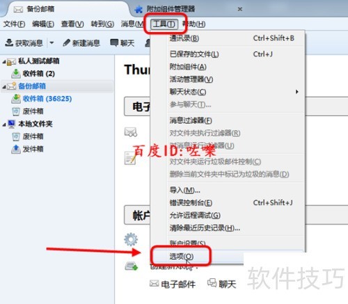 9、 若需自动启用Thunderbird反垃圾邮件功能,请进入菜单栏,选择工具,然后点击选项进行设置。