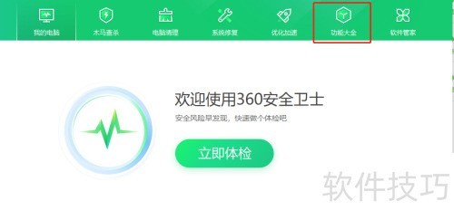1、 启动360安全卫士,进入主界面后找到并点击功能大全即可开启。