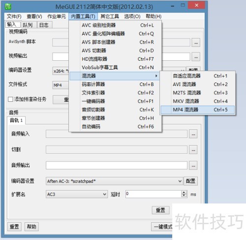 5、 启动MeGui,依次选择内置工具、混流器及MP4混...