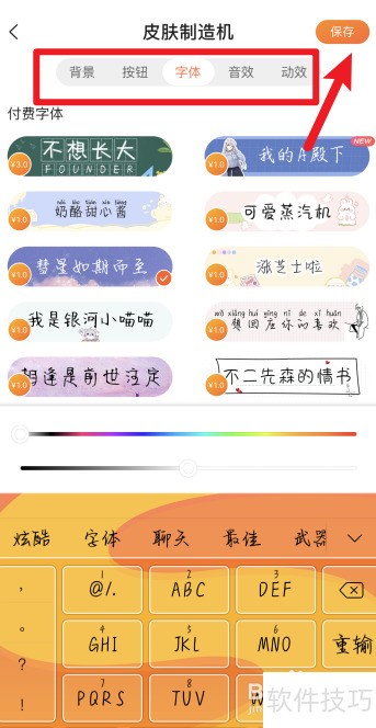 3、 按个人偏好调整背景、按钮、字体及音效动效,完成后点击保存即可。