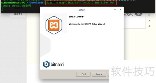 5、 使用Root超级用户权限执行xampp-linux-x64-7.0.30-0-installer.run文件来安装Xampp,具体操作所示。