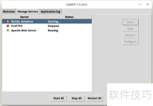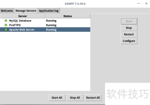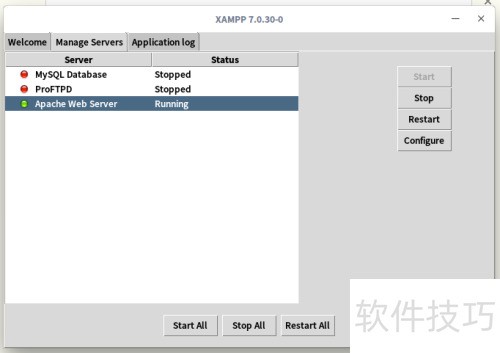 8、 在页面顶部点击Manager Servers标签,进入后会看到三个服务器,其状态均为Stop(已停止)。依次选择MySQL Database、proFTPD和Apache Web Server,分别点击Start按钮启动各项服务。每项服务成功启动后,对应服务器名称前方的指示灯将变为绿色并点亮,表示运行正常,具体效果可参考下方示意图。