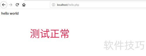 11、 在浏览器地址栏输入 http://localhost/hellp.php 并访问,若页面显示hello world,则表示测试成功,具体效果可参考成功示例图。