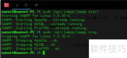 12、 在终端输入 sudo /opt/lampp/lampp start 可启动服务器,输入 sudo /opt/lampp/lampp stop 可停止服务器,操作方式所示。