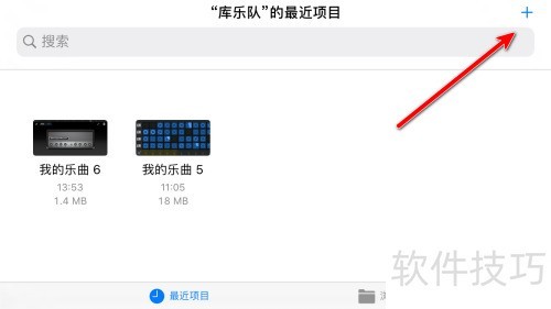 1、 启动库乐队应用后,进入主界面,点击右上角的+号按钮。