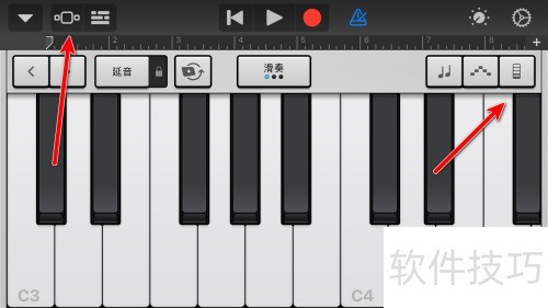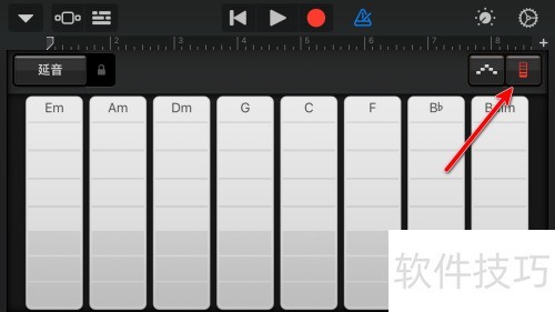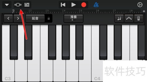 10、 右上角梯形图标用于切换键盘样式,点击顶部三个方框图标可返回并选择其他乐器。