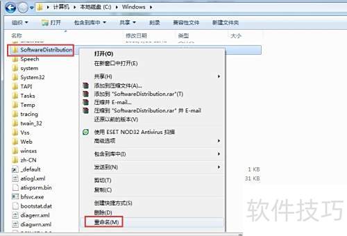 2、 进入C盘Windows目录,找到SoftwareDistribution文件夹,将其重命名为SDold即可。