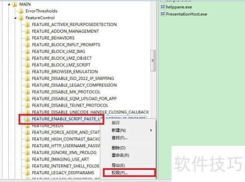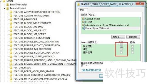 7、 方法一:展开主目录下的FeatureControl文件夹,定位到FEATURE_ENABLE_SCRIPT_PASTE_URLACTION_IF_PROMPT子项,在其权限设置中勾选完全控制,以确保该功能获得最高操作权限,从而正常运行相关脚本与粘贴操作。