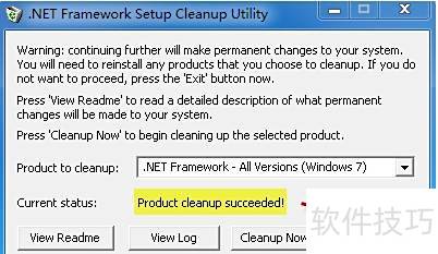 12、 当提示Product cleanup succeeded时,说明清理已完成,点击退出并重启计算机,随后重新安装NET Framework即可顺利完成安装。