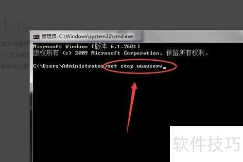 1、 启动电脑后,进入管理员界面,输入net stop wuauserv并按回车,即可停止相关服务。