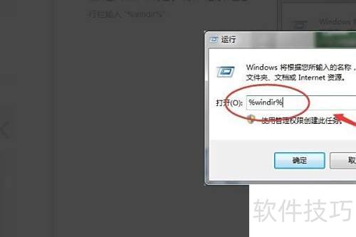 2、 在运行程序中输入%windir%,然后点击确定即可。