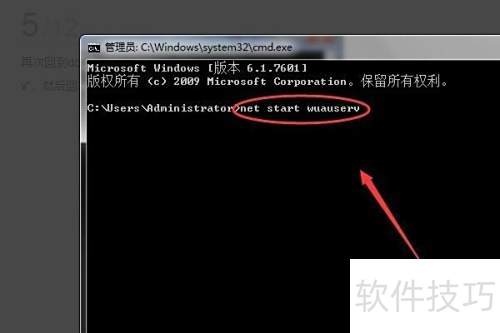 5、 返回管理员界面,输入net start wuauserv并按回车,即可重新启动该服务。