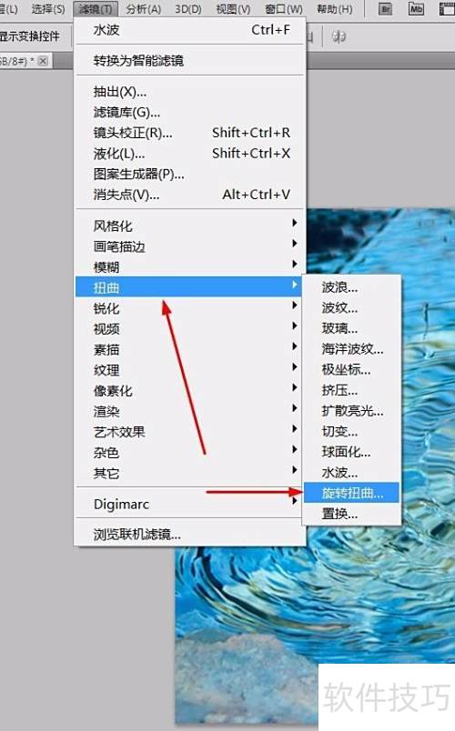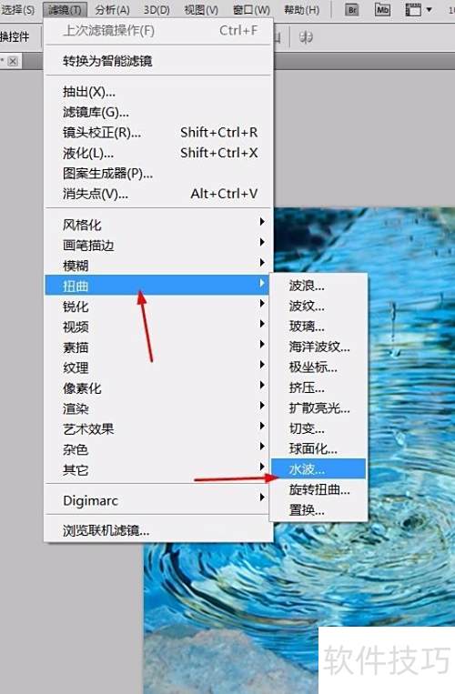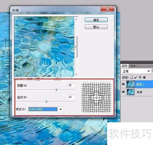 2、 选择滤镜中的扭曲选项,点击水波命令,参数设置参照附图。