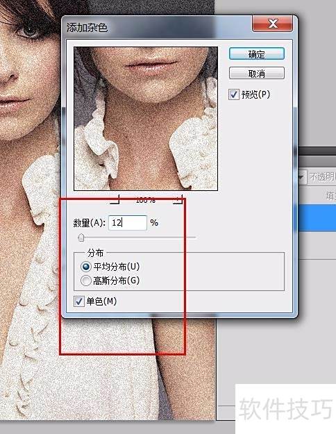 5、 执行滤镜中的杂色功能,添加杂色并按图示参数设置,呈现所示效果。
