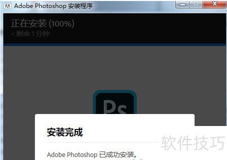 4、 Adobe Photoshop CC 2020 已安装完毕,点击关闭按钮,所示。