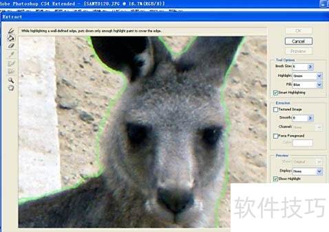 3、 在抽出对话框左侧选择缩放工具,连续三次单击袋鼠图像以放大显示。