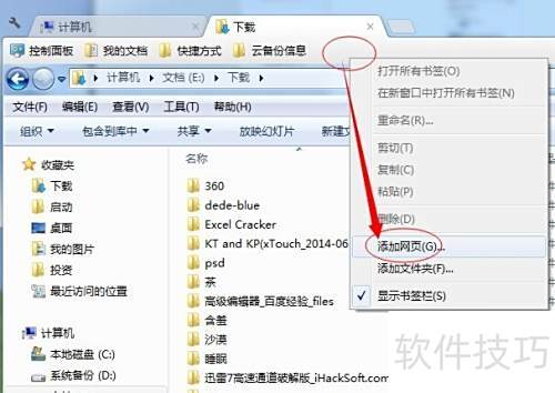 4、 它具备类似浏览器的书签功能,只需在资源管理器标签下的书签栏右键点击,选择添加网页,命名后确认即可保存。此后若需访问该路径,只需点击书签栏中的对应标签,即可快速打开,操作便捷高效。