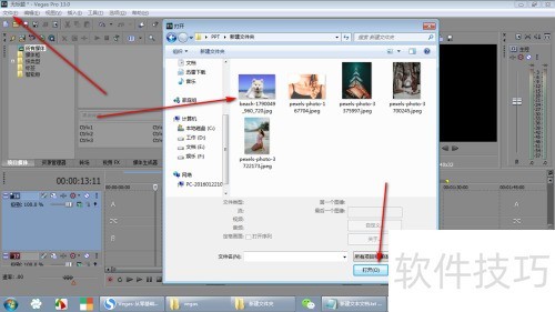 1、 点击文件菜单,选择需编辑的图片,打开并导入到vegas中即可开始操作。
