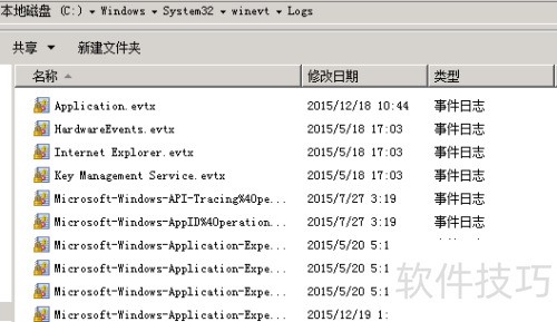6、 进入C盘Windows系统目录下的System32中的winevt文件夹,打开Logs子目录,即可查看服务器日志文件。