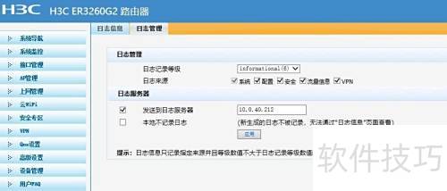 8、 在路由器设置中,进入日志管理,勾选需记录的日志类型,并将日志服务器地址配置为启用syslog功能的设备IP地址。