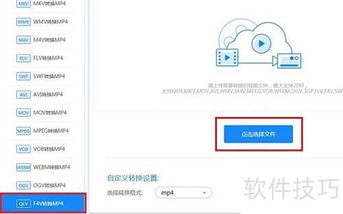 5、 在格式转换界面左侧选择F4V转MP4,点击点击选择按钮,在弹出窗口中添加视频文件,随后在自定义设置里选定目标格式,完成转换设置即可。
