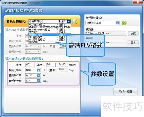 3、 F4V是采用H264编码的高清FLV格式。当需要将MTS视频转换为F4V时,只需将视频导入软件,在设置待转换的视频参数界面中,于转换后的格式下拉菜单选择高清FLV即可完成格式设定。该软件不仅支持F4V,还能导出多种主流格式,如RMVB、AVI、WMV、GIF,以及DVD、VCD等光盘格式,适用范围广泛。通常情况下,使用软件默认参数导出的F4V文件画质已相当理想,能够满足大多数用户的观看需求。若用户具备一定的视频处理知识,也可在该界面下方手动调整分辨率、码率、帧率等参数,以进一步优化输出效果,实现更个性化的转换需求。