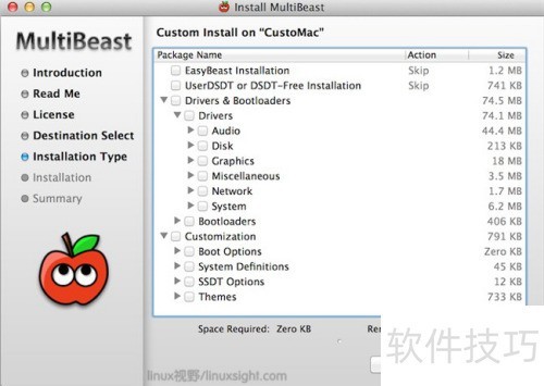 5、 第六步:安装Mac OS系统。重启后会出现变色龙引导界面,选择进入安装程序。使用磁盘工具将之前准备的20G分区格式化,随后开始系统安装,具体过程按提示操作即可完成。