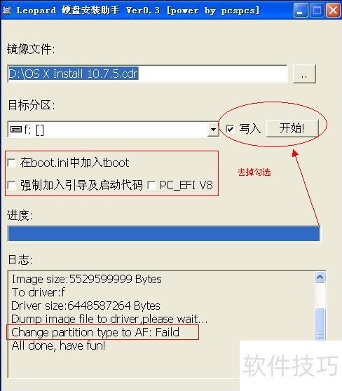 3、 第三步:写入镜像。通过硬盘助手Leopard HD Install Helper,将懒人版镜像写入启动盘,取消下方三项勾选后开始写入,过程中可能出现假死现象,属正常情况,无需干预。