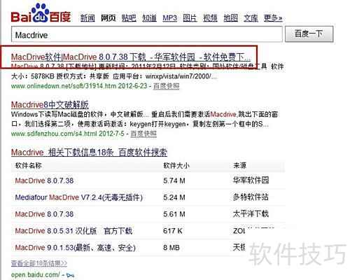 1、 在百度搜索Macdrive,点击搜索结果中的第一条链接即可。