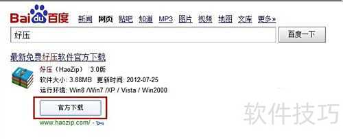 13、 搜索好压关键词,点击百度结果中第一条链接下方的官方下载按钮进行下载。