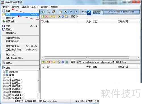 9、 打开UltraISO软件,点击文件菜单,选择打开命令即可。