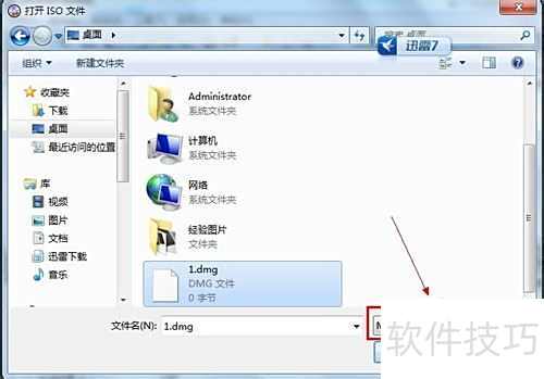 10、 在打开ISO文件窗口中,点击右下角的下拉菜单,选择Mac(*.dmg;*.timg;*.hfs)格式,接着找到dmg文件所在路径,选中该文件,最后点击打开按钮即可完成操作。