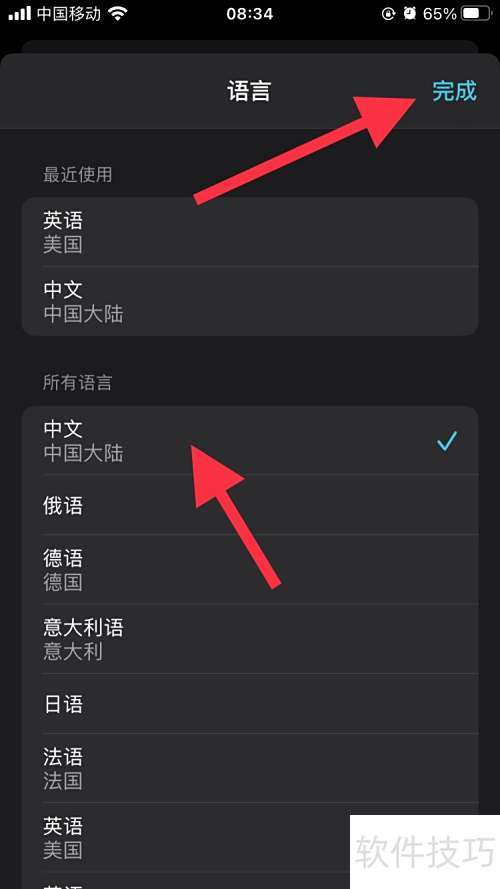 2、 进入语言页面,选择所需语言后,点击右上角完成即可。
