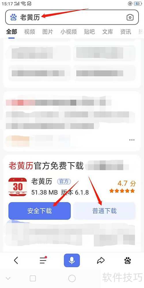 1、 在百度搜索老黄历,进入图示网页后,按需选择安全下载或普通下载即可。