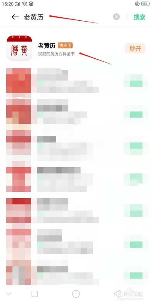 2、 在手机应用商店中搜索老黄历,选择图示结果即可下载安装。