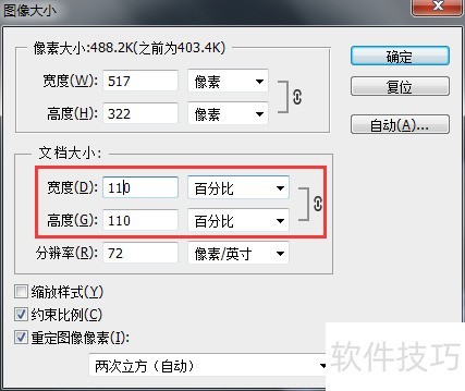 8、 将文档大小单位设为百分比,仅使用110%的比例,可使图像放大10%。此方法在Photoshop以10%逐步放大时,能有效减轻图像失真现象,保持画质相对清晰稳定。