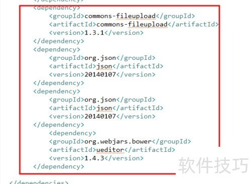 3、 在pom.xml配置文件中添加图示的依赖代码,适用于Maven项目;若非Maven项目,可直接通过Build Path方式引入所需包。
