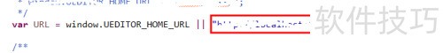 4、 请将ueditor.config.js第22行的路径修改为项目在浏览器中访问的路径,指向你刚复制的文件夹,具体所示。