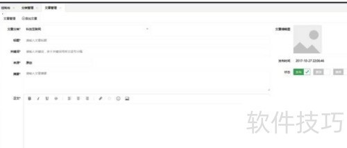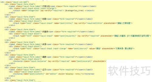 1、 首先构建文章发布或编辑的表单,初始化Layui富文本编辑器,具体效果及对应HTML代码如下所示。