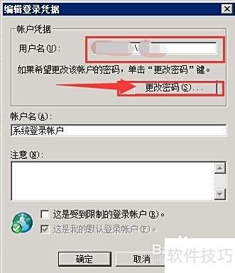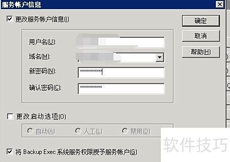 3、 在Symantec工具栏中选择Backup Exec服务,进入服务窗口后打开用户凭据设置,输入新的账号和密码。参照图示,在两个选项前均打上勾选,分别用于更新服务账户信息,并将系统服务权限授予该账户。完成设置后,保存更改并重启所有相关服务,确保配置生效。