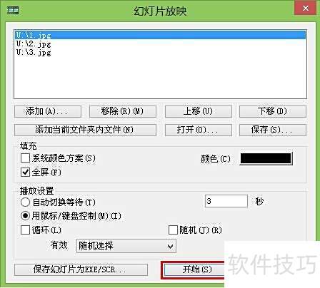 4、 在弹出的放映窗口中,点击开始(S)即可进入图片播放界面,具体操作所示。