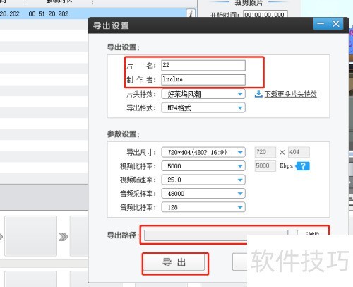 12、 点击导出视频后,将弹出设置窗口,需填写片名、制作者信息,并选择导出路径,即视频保存的位置。