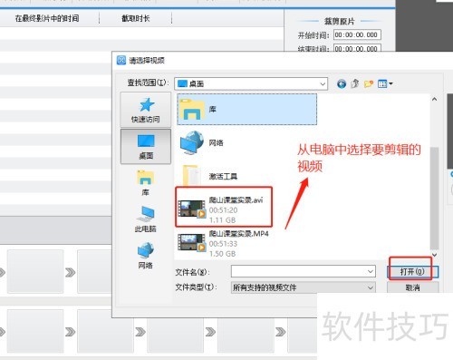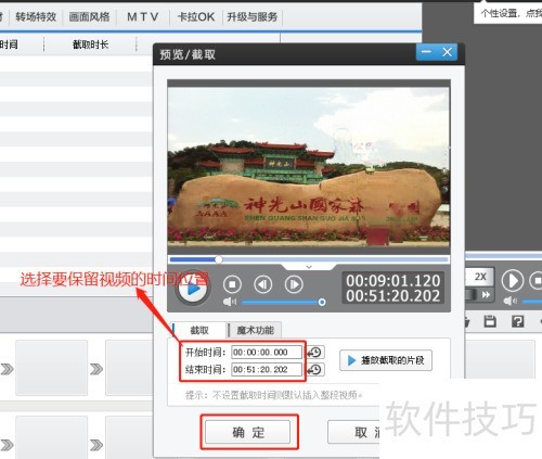6、 点击打开后会出现设置窗口,可设定需保留的视频时间段,调整好剪辑范围并确认无误后,点击确定完成操作。