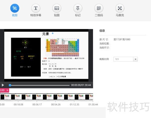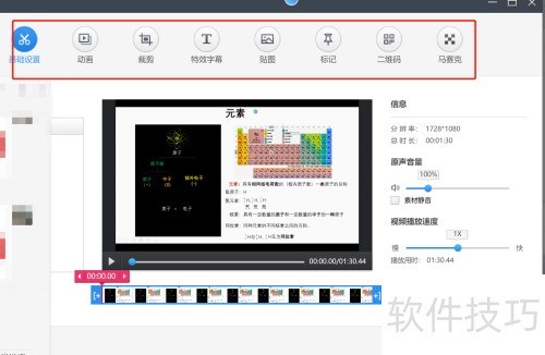 6、 进入下图所示页面,可对视频进行动画、剪辑、特效、字幕、贴图及标记等操作。