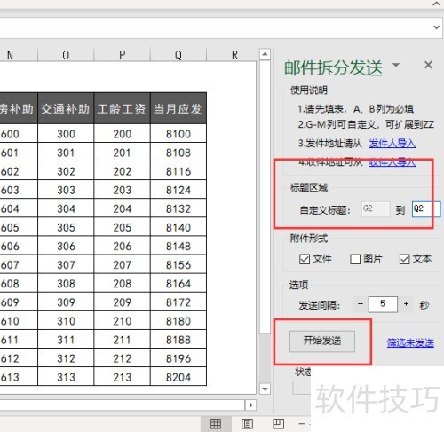 6、 在自定义标题处输入工资表标题所在单元格Q2,随后点击开始发送按钮即可。