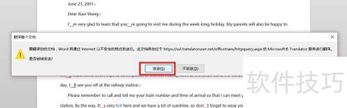 4、 此时会弹出确认发送界面,因Word文档通过外部链接实现在线翻译,内容将以明文形式传输,确认无误后,直接点击发送按钮即可完成操作。