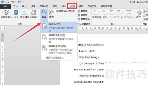 2、 Word具备强大的翻译功能。打开外语文档后,进入审阅选项卡,点击翻译下拉菜单,选择翻译文档即可完成全文翻译,操作简便,便于用户快速理解外文内容。