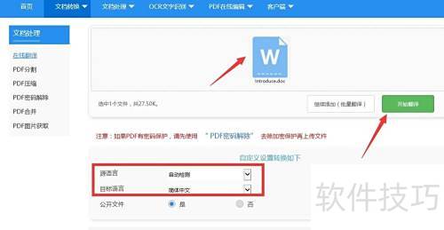 7、 在在线翻译页面中,点击添加文件按钮,可免费批量导入需翻译的文档,并根据需要设定目标语言和输出文件格式,操作简便,所示。